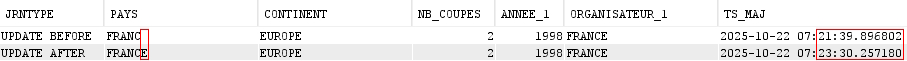Après découpage et conversion, on voit que le ‘FRANC’ a été remplacé par ‘FRANCE’ et que le timestamp de modification de l’enregistrement a été mis à jour également.