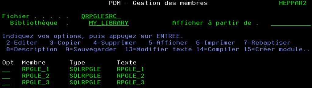 Cet exemple sera basé sur le fichier source QRPGLESRC de la biblitohèque MY_LIBRARY.